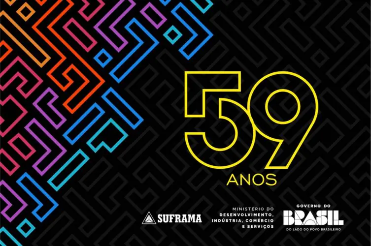 Como parte das comemorações pelo aniversário, a Suframa também lança a marca dos 59 anos da Zona Franca de Manaus, que é formada por dois algarismos na cor amarelo, cor que representa otimismo, energia, alegria, além de ser a cor do ouro, metal precioso que simboliza as bodas de cinco décadas das quais o modelo se despede este ano, rumo aos 60 anos. O algarismo 5 simula uma seta em curva, simbolizando a renovação constante do modelo Zona Franca enquanto o 9 é sólido e fluido, como nosso modelo econômico. Os números vazados harmonizam com a imagem de fundo – uma série de figuras geométricas que remetem aos jogos clássicos dos primeiros videogames. Tal imagem busca lembrar, além da questão da tecnologia, que a ZFM está sempre avançando novas fases e vencendo desafios com arrojo e modernidade.