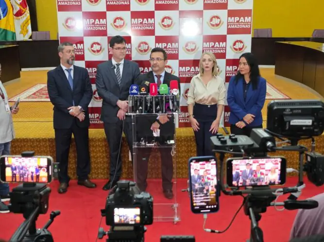Em coletiva, o MPAM reuniu jornalistas na sede do auditório Carlos Alberto Bandeira de Araújo, nesta manhã. Além do promotor Edinaldo Medeiros, estiveram presentes o coordenador do Gaeco do MPAM, promotor Leonardo Tupinambá do Valle, e integrantes do grupo — as promotoras Priscilla Carvalho Pini e Lilian Nara Pinheiro de Almeida e o promotor Iranilson de Araújo Ribeiro.