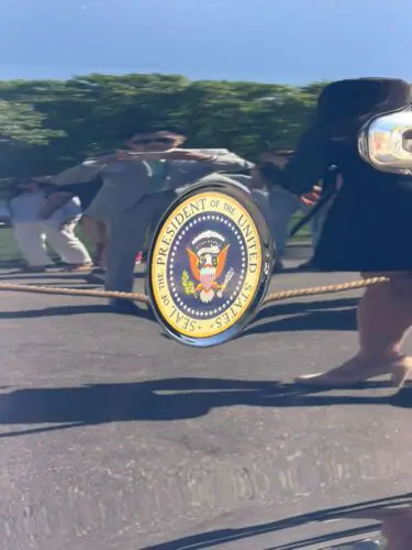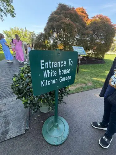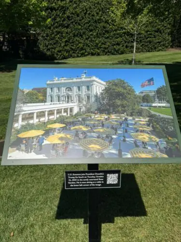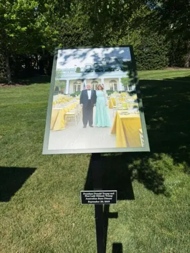 Caminhamos pelo jardim com calma, e logo percebemos que ele conta histórias por si só. Espalhadas pelo espaço, diversas fotos registram os grandes eventos que acontecem ali ao longo do ano — o Easter Egg Roll da Páscoa, as celebrações de Thanksgiving, recepções de chefes de Estado. Pelos painéis, rostos familiares: Obama, Biden, George W. Bush — cada imagem um capítulo diferente da história americana.