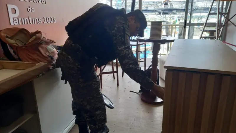 O capitão PM Padilha explica que, ao todo, são realizadas quatro varreduras antibomba durante o festival, incluindo a inspeção feita antes da tradicional Festa dos Visitantes, que marca o início das celebrações.