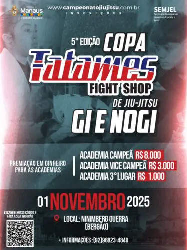 No dia 1 de novembro, o ginásio Bergão, no São Jorge, Zona Oeste de Manaus, receberá a quinta edição da Copa Tatames Fight Shop de Jiu-Jítsu Gi e Nogi. O evento é uma realização de João Bosco Júnior, empreendedor do esporte que dirige franquias de renome da arte suave, como os eventos Jungle Classic e a Copa Encontro das Águas. O campeonato vai pagar R$ 12 mil de premiação, a ser dividido para as três melhores equipes, sendo R$ 8 mil (campeã), R$ 3 mil (vice-campeã) e R$ 1 mil (terceira colocada)