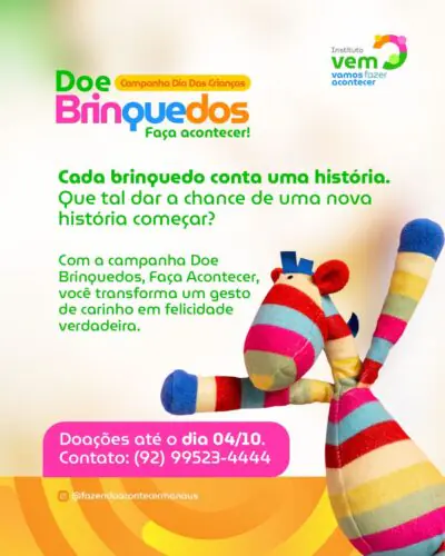 MANAUS, AM – Com o objetivo de transformar o Dia das Crianças para diversas amílias em situação de vulnerabilidade, o Instituto Vem Vamos Fazer Acontecer deu início à campanha “Doe Brinquedos, Faça Acontecer – Porque brincar também transforma”. A iniciativa, idealizada pela relações públicas Tainara França, busca arrecadar brinquedos novos e usados (em bom estado) para distribuição na data comemorativa. O projeto reforça o poder transformador do brincar e convida a sociedade a dar um novo propósito a brinquedos esquecidos, transformando-os em sorrisos.