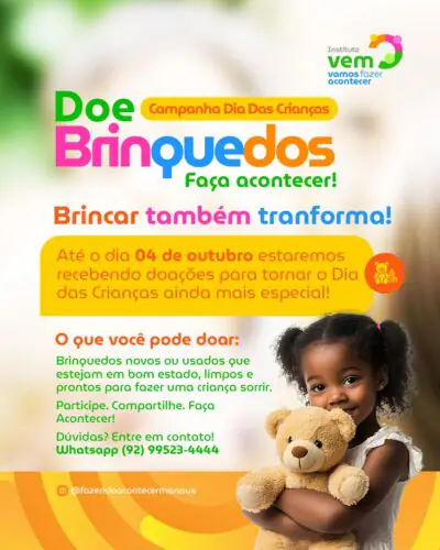 MANAUS, AM – Com o objetivo de transformar o Dia das Crianças para diversas amílias em situação de vulnerabilidade, o Instituto Vem Vamos Fazer Acontecer deu início à campanha “Doe Brinquedos, Faça Acontecer – Porque brincar também transforma”. A iniciativa, idealizada pela relações públicas Tainara França, busca arrecadar brinquedos novos e usados (em bom estado) para distribuição na data comemorativa. O projeto reforça o poder transformador do brincar e convida a sociedade a dar um novo propósito a brinquedos esquecidos, transformando-os em sorrisos.