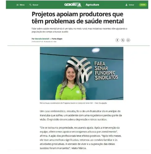 Idealizado pelo Senar Nacional para levar assistência e promoção da saúde a produtores rurais e de seus familiares atendidos pela Assistência Técnica e Gerencial (ATeG), o Programa Saúde no Campo, do Senar Regional Amazonas (Senar-AR/AM), foi destaque na edição de março da Revista Globo Rural, da Editora Globo. A reportagem destaca projetos que, por todo o Brasil, apoiam produtores rurais a superarem problemas de saúde mental.