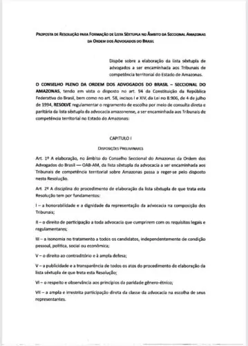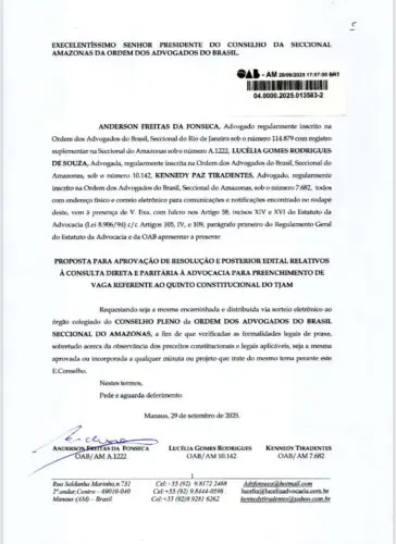 Foi protocolada no Conselho Pleno da OAB/AM uma proposta de resolução que regulamenta a formação da lista sêxtupla destinada ao preenchimento de vaga no Tribunal de Justiça do Amazonas (TJAM), pelo quinto constitucional.