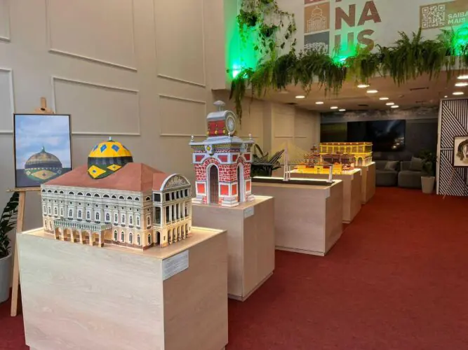 A mostra de monumentos históricos “Manaus em Papel”, é uma criação do artista plástico Wendel Gustavo. Ele utiliza a técnica de papercraft para transformar papel em esculturas. Ícones como o Teatro Amazonas, o Relógio Municipal, o Mercado Adolpho Lisboa, a Alfândega e a Ponte Jornalista Phelippe Daou, retratam Manaus com minúcia e sensibilidade.